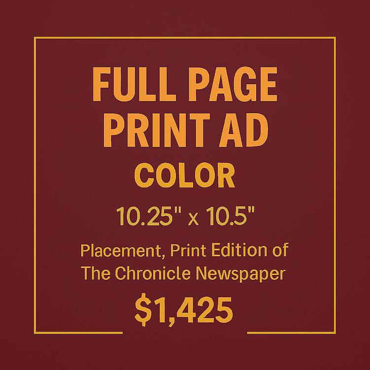 Go big and bold with our Full Page Color Ad — the ultimate statement in community advertising. This premium placement gives your message the spotlight across an entire page of The Chronicle, delivering unmatched visibility to over 10,000 engaged readers.