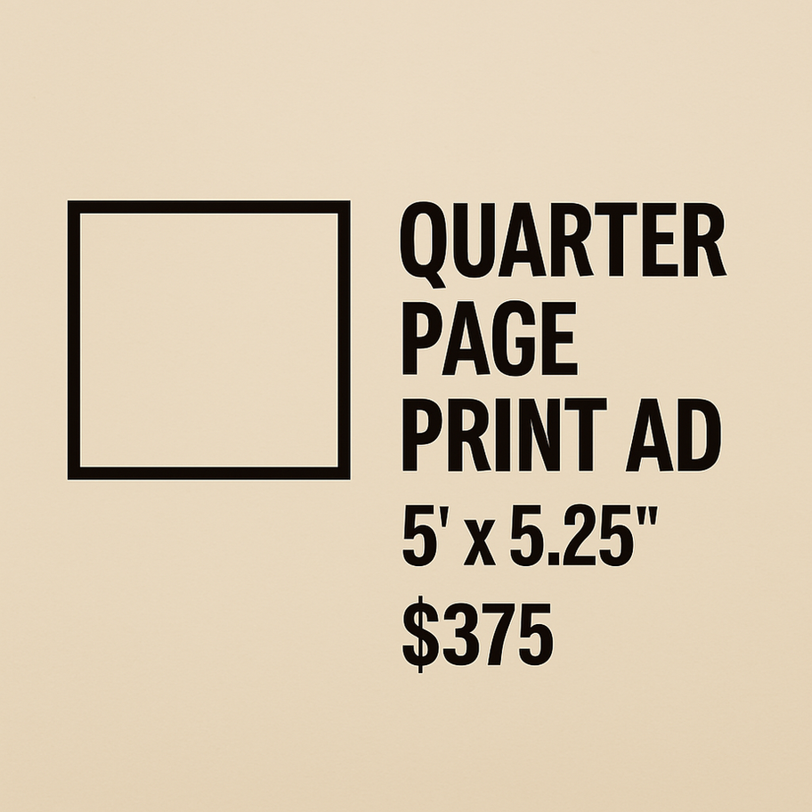 📰 Quarter Page Print Ad – Black & White Size: 5” x 5.25” Placement: Print